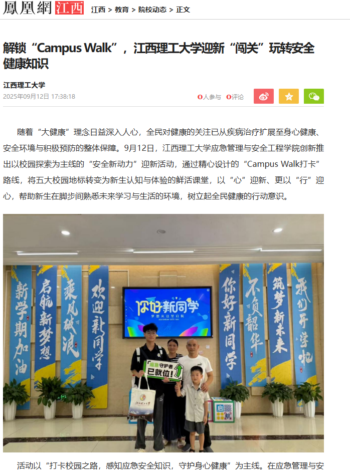 随着“大健康”理念日益深入人心,全民对健康的关注已从疾病治疗扩展至身心健康、安全环境与积极预防的整体保障。9月12日,江西理工大学应急管理与安全工程学院创新推出以校园探索为主线的“安全新动力”迎新活动,通过精心设计的“Campus Walk打卡”路线,将五大校园地标转变为新生认知与体验的鲜活课堂,以“心”迎新、更以“行”迎心,帮助新生在脚步间熟悉未来学习与生活的环境,树立起全民健康的行动意识。