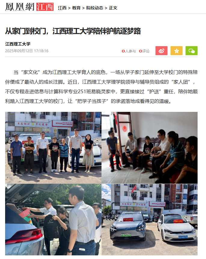 现在,易晓灵已经在江西理工大学开启了大学生活。“老师从家里把我接到学校,这份温暖我记在心里,我一定会更加努力。”既以学识改善家庭困境、撑起“小家”,更立报国之志,以过硬本领服务“大家”,这既是理学院院长徐中辉对易晓灵的暖心寄语,也是她的青春宣言。这场从家门到校门的陪伴,不仅是一次简单的报到护航,更是江西理工大学以“家文化”赋能学子成长的生动实践。(文/张琼方、胡庆杰、饶佳琳 图/李圆、周煌浚)