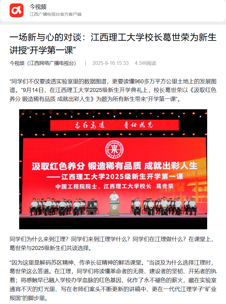 “同学们不仅要读透实验室里的数据图谱,更要读懂960多万平方公里土地上的发展图谱。”9月14日,在江西理工大学2025级新生开学典礼上,校长葛世荣以《汲取红色养分 锻造稀有品质 成就出彩人生》为题为所有新生带来“开学第一课”。