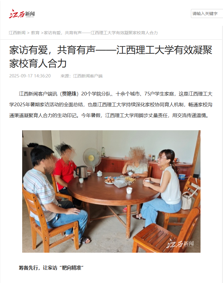 江西新闻客户端讯(贾艳珠)20个学院分队、十余个城市、75户学生家庭,这是江西理工大学2025年暑期家访活动的全面总结,也是江西理工大学持续深化家校协同育人机制,畅通家校沟通渠道凝聚育人合力的生动印记。今年暑假,江西理工大学用脚步丈量责任,用交流传递温情。