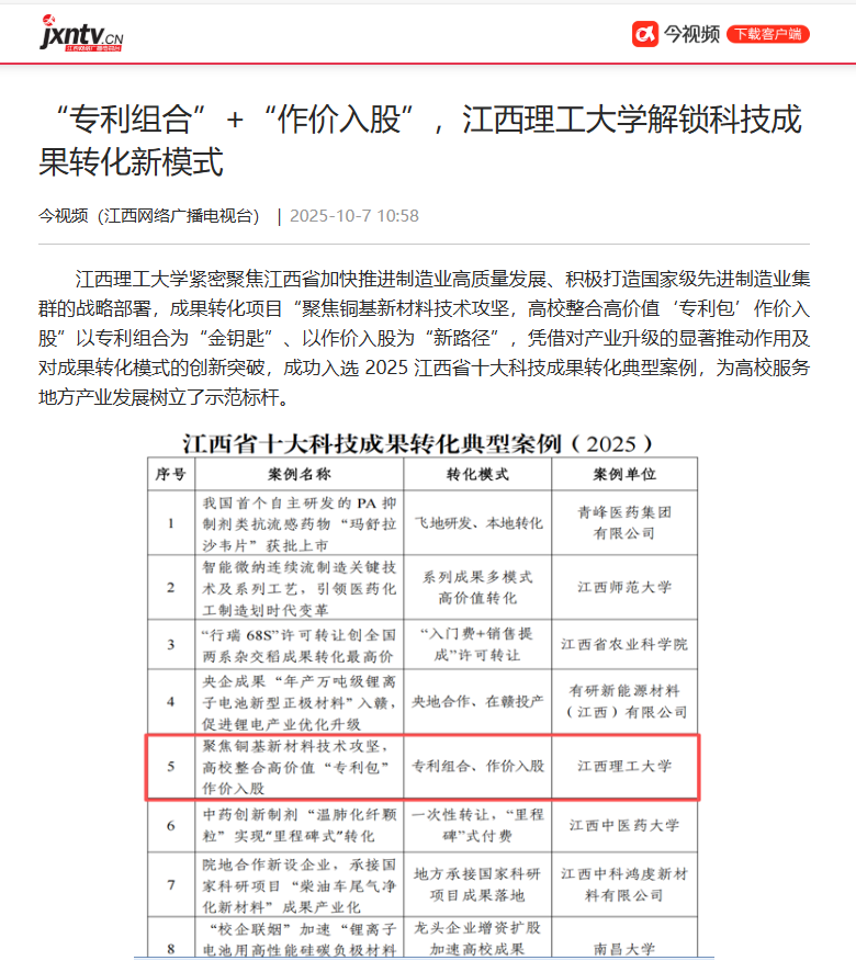 这一专利整合作价入股项目是江西理工大学深化校企合作、推动产学研深度融合的生动实践。江西理工大学先进铜产业学院(鹰潭)院长、江西先进铜功能材料科技有限公司总经理肖翔鹏表示:“这次入选2025年江西省十大科技成果转化典型案例,既是对学校科技成果转化工作的充分认可,也将推动学校‘专利包集成+产业联盟’转化模式在全省乃至全国范围内推广,为更多相关产业领域的创新发展提供可复制、可借鉴的实践样本。”