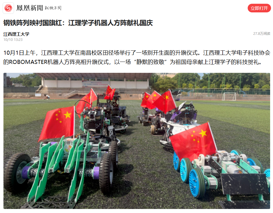 10月1日上午,江西理工大学在南昌校区田径场举行了一场别开生面的升旗仪式。江西理工大学电子科技协会的ROBOMASTER机器人方阵亮相升旗仪式,以一场“静默的致敬”为祖国母亲献上江理学子的科技贺礼。
