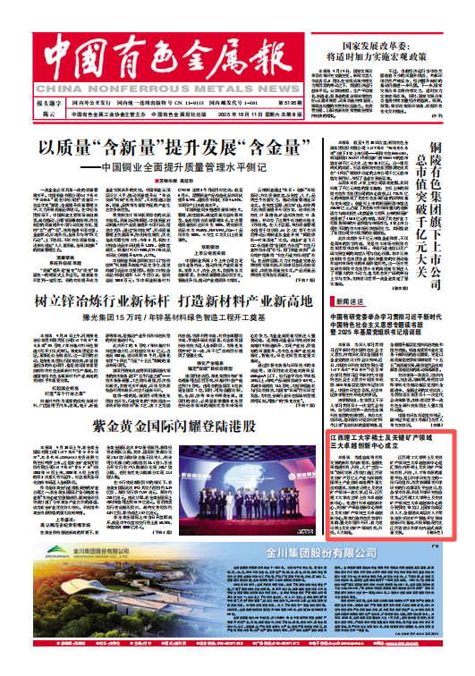 《中国有色金属报头版》:江西理工大学稀土及关键矿产领域 三大卓越创新中心成立