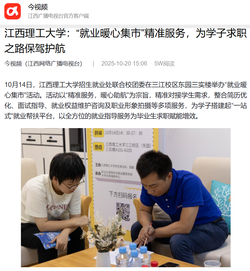 10月14日,江西理工大学招生就业处联合校团委在三江校区东园三实楼举办“就业暖心集市”活动。活动以“精准服务,暖心助航”为宗旨,精准对接学生需求,整合简历优化、面试指导、就业权益维护咨询及职业形象拍摄等多项服务,为学子搭建起“一站式”就业帮扶平台,以全方位的就业指导服务为毕业生求职赋能增效。