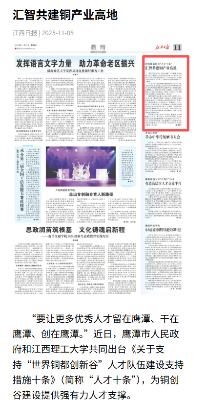 “要让更多优秀人才留在鹰潭、干在鹰潭、创在鹰潭。”近日,鹰潭市人民政府和江西理工大学共同出台《关于支持“世界铜都创新谷”人才队伍建设支持措施十条》(简称“人才十条”),为铜创谷建设提供强有力人才支撑。