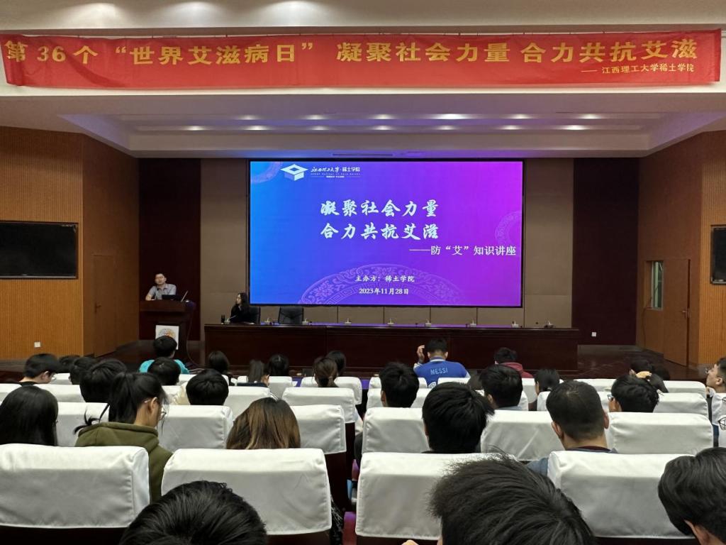 此外,稀土学院在黄金校区逸夫楼报告厅举行了以“凝聚社会力量,合力共抗艾滋”为主题的防“艾”知识讲座。讲座由医疗康养中心(校医院)肖银芳医生主讲,稀土学院全体学生参加。