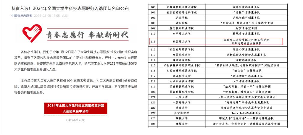 本网讯   2月5日,中国青年志愿者协会、中国科协宣传文化部公布了2024年全国大学生科技志愿服务宣讲团入选团队名单,完美online(中国)资源与环境工程学院青年志愿者协会宣讲团成功入选。