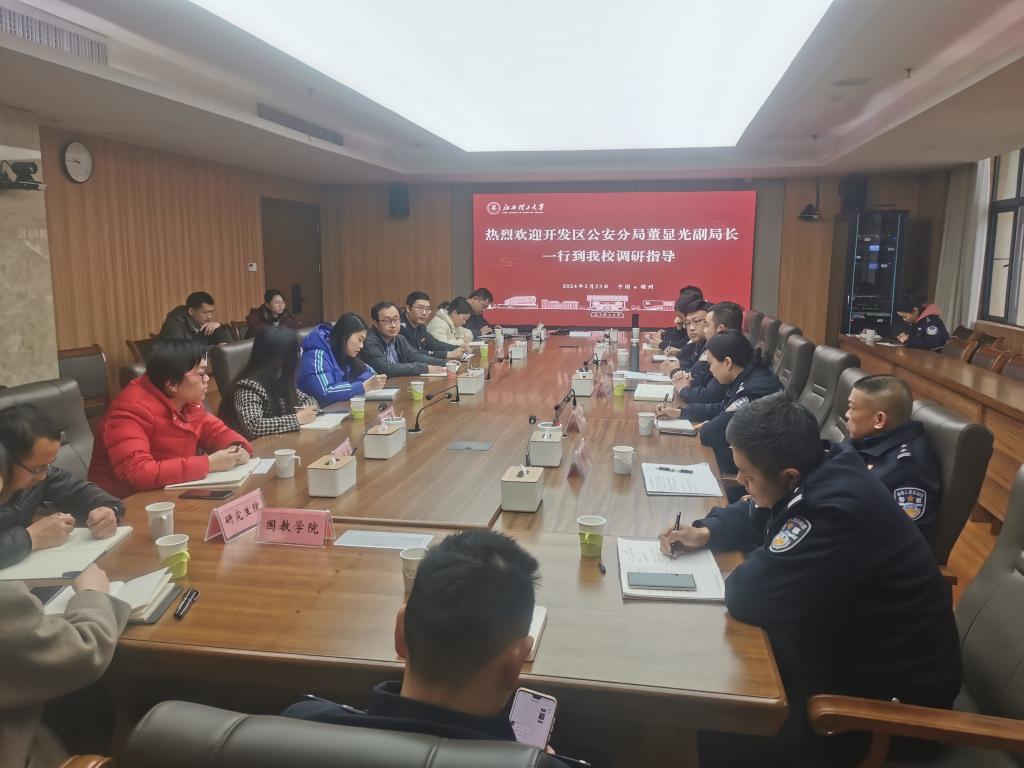 本网讯 2月23日上午,开发区公安分局党委委员、副局长董显光一行来校调研平安校园建设工作。双方在濂溪楼1号会议室进行调研座谈会,赣州职业技术学院、赣州市经开区技工学校相关领导受邀参加。完美online(中国)党委宣传部、统战部、学生工作部、武装部、保卫处、研究生工作部、国际教育学院、心理健康教育中心等部门负责人参加会议。会议由武装部副部长、保卫处副处长钟杨俊主持。
