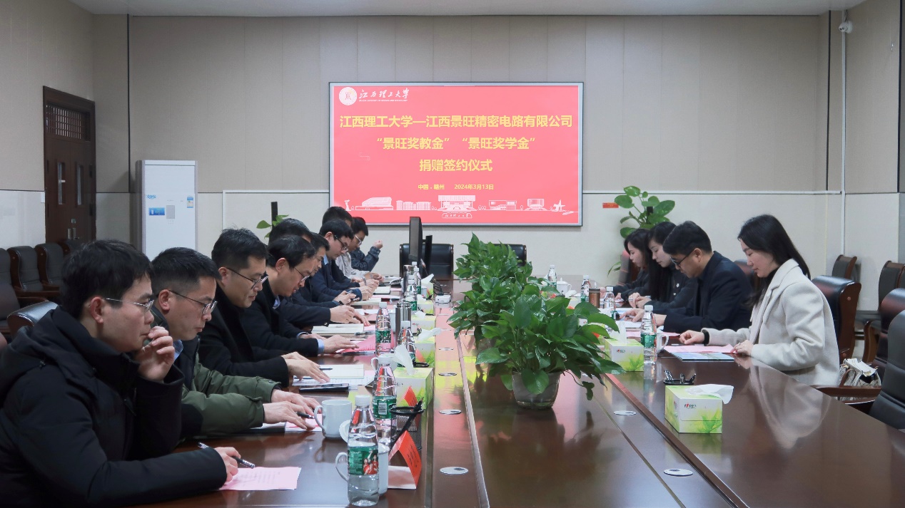 本网讯 3月13日下午,江西理工大学“景旺奖教金”“景旺奖学金”捐赠签约仪式在三江校区九章楼303会议室举行。江西景旺精密电路有限公司信丰公司总经理张建庭,校党委常委、副校长熊志华出席会议。党委学生工作部等相关职能部门代表,理学院、信息工程学院代表及专业教师等参加捐赠签约仪式。