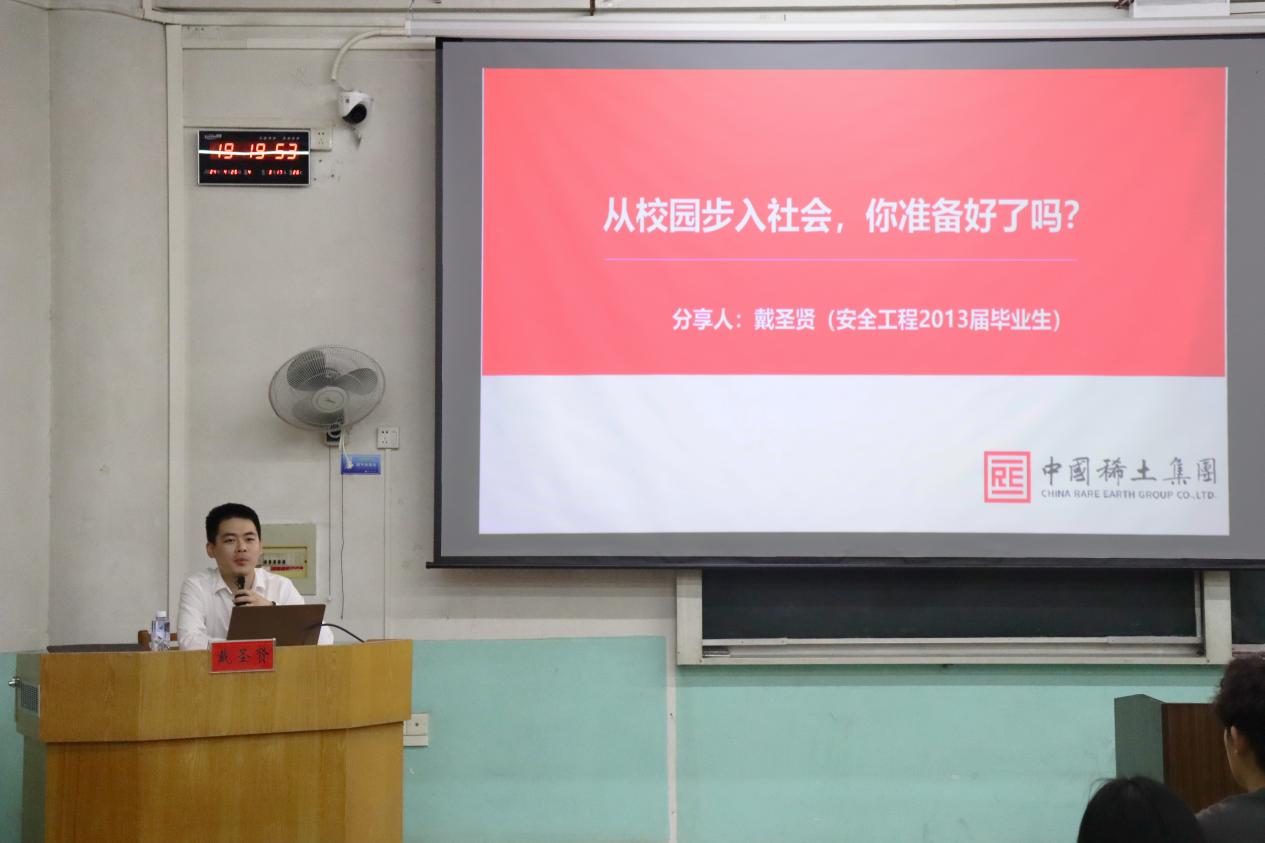 本网讯 4月25日,应急管理与安全工程学院在红旗校区主教学楼D02教室举办“红蓝绿”讲坛——与校友面对面,邀请中国稀土集团南方稀土国际贸易有限公司副总经理、安全工程专业2013届毕业生戴圣贤作题为《从校园步入社会,你准备好了吗?》的讲座。讲座由学院党委副书记李肖锋主持。应急管理与安全工程学院学生参加讲座。