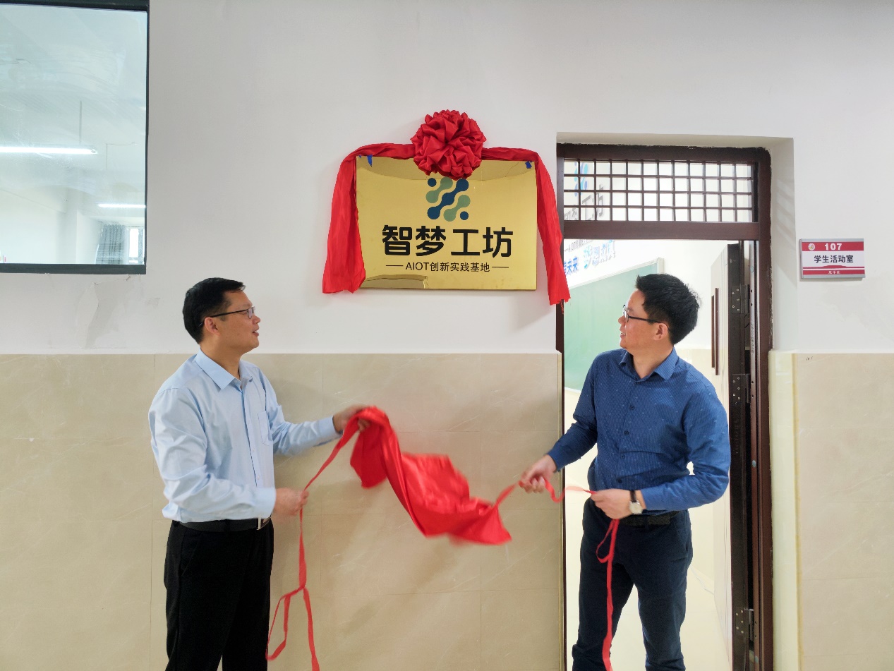 仪式上,熊志华和黄玉坤代表校企双方共同为 “智梦工坊——AIOT创新实践基地”揭牌。