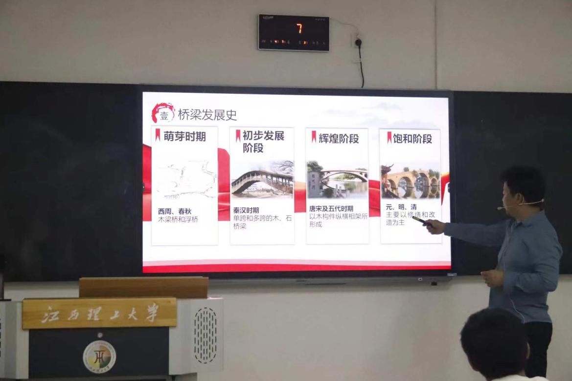 主题思政课上,丰土根教授还为同学们介绍了见证中共一大胜利召开的宣公桥,承继了红军艰苦卓绝的长征精神的云贵红军桥,沂蒙妇女不畏冰冷、舍生忘我用身体搭建的“人桥”,江西兴国的红军桥、瑞金武阳大桥、于都红军大桥、信丰嘉定桥……这些桥梁不仅是交通要道,更是红色文化的象征,承载着革命先烈的英勇事迹和崇高精神。在场的学生们都热血沸腾,土木222班封磊表示:“通过丰教授的介绍,我学习到了先辈们的造桥精神和吃苦精神,作为江西人,未来将持续深入江西各地挖掘红色桥梁故事,让一座座精神图腾在赣鄱大地上赓续相传。”