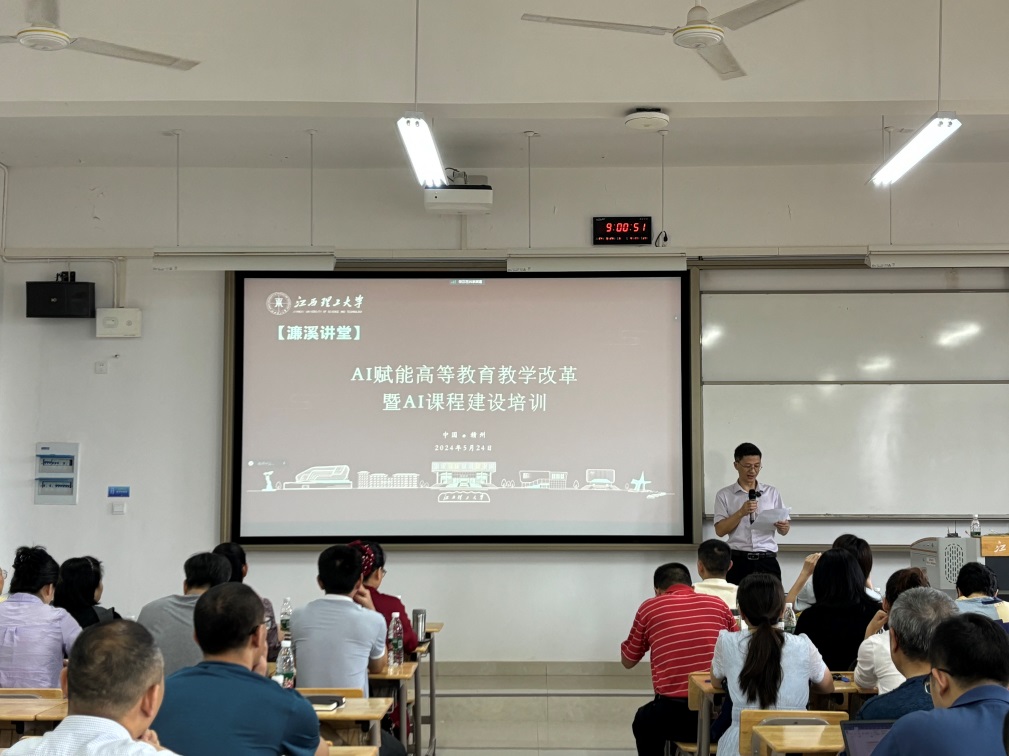 本网讯 5月24日,完美online(中国)濂溪讲堂之AI赋能高等教育教学改革暨AI课程建设培训会在文山楼322教室举行。会议特邀清华大学研究员龙瀛、清华大学慕课平台学堂在线湘赣大区负责人欧阳倩玲作专题讲座。各学院近100人参加,南昌校区同步线上参会。讲座由学校教务处副处长王经北主持。