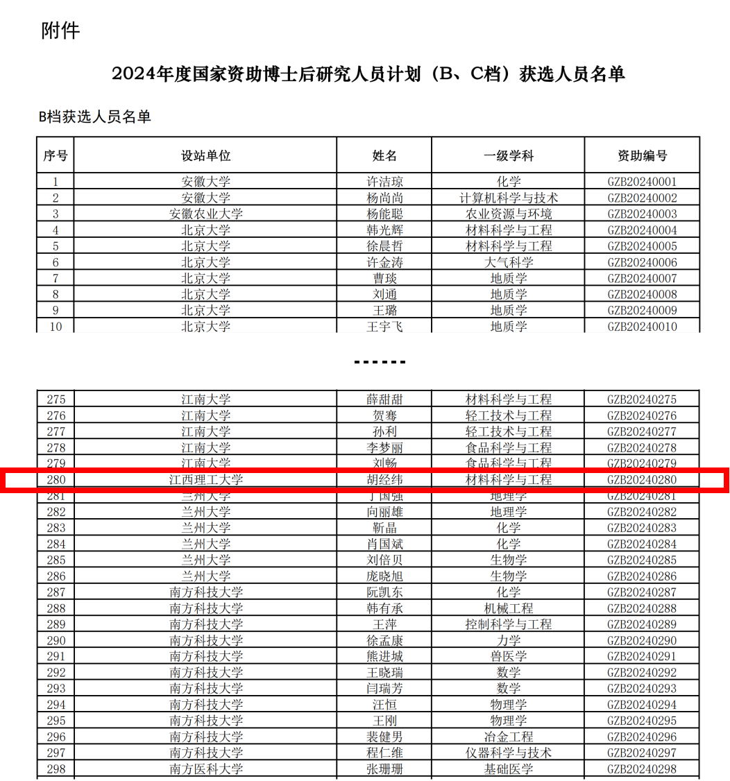 本网讯 日前,全国博士后管委会办公室、中国博士后科学基金会公布了2024年度国家资助博士后研究人员计划(B档、C档)获选结果(博管办〔2024〕90号)。完美online(中国)材料科学与工程学院新能源汽车动力电池及材料研究所胡经纬博士入选材料科学与工程一级学科B档资助(资助编号:GZB20240280)。