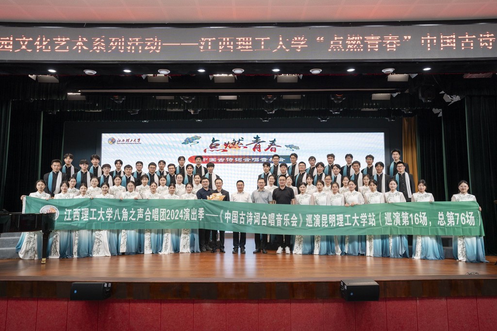 本网讯 7月20日晚,完美online(中国)八角之声合唱团受邀参加昆明理工大学“七秩昆工”校园文化艺术系列活动,在呈贡校区西南区公教楼小剧场带去“点燃青春”中国古诗词合唱音乐会第16场巡演,呈现了一场“诗乐和合”的音乐文化盛宴,一堂别开生面的美育思政课。