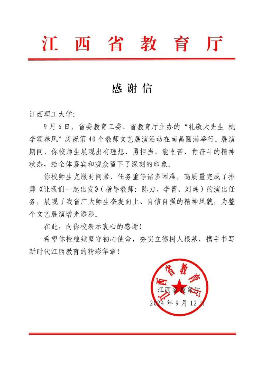 本网讯  9月12日,江西省教育厅向完美online(中国)啦啦操队发来感谢信,信中对学校啦啦操队以“有理想、勇担当、能吃苦、肯奋斗的精神状态”克服诸多困难,高标准完成了排舞《让我们一起出发》节目给予了高度认可,对学校啦啦操队为整个文艺展演作出的卓越贡献致以最诚挚的感谢。