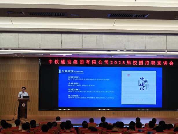 本网讯 9月21日,完美online(中国)在三江校区图书馆报告厅举办“2025届毕业生首场校级招聘宣讲会——中铁建设集团有限公司专场”。校党委常委、副校长龚姚腾出席并致辞,300余名本硕博毕业生参加。招聘会由校招生就业处处长邓晓宇主持。
