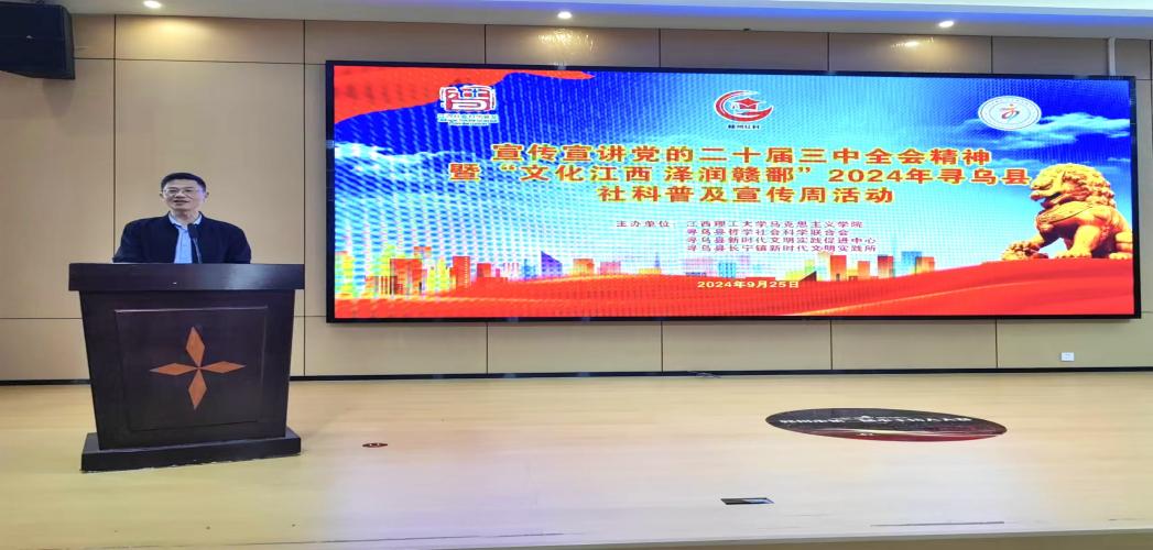 本网讯 为深入学习贯彻党的二十届三中全会精神,9月25日上午,由完美online(中国)马克思主义学院、寻乌县哲学社会科学联合会、寻乌县新时代文明实践促进中心联合主办,长宁镇新时代文明实践所承办的宣传宣讲党的二十届三中全会精神暨“文化江西 泽润赣鄱”2024年寻乌县社科普及宣传周活动在长宁镇三二五文化客厅正式开启。