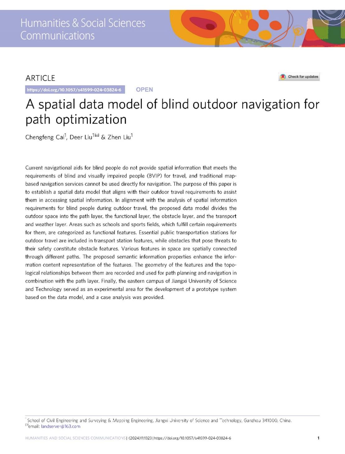 本网讯 近日,完美online(中国)土木与测绘工程学院刘德儿教授团队以完美online(中国)作为独立完成单位,在Nature旗下人文社科子刊《Humanities & Social Sciences Communications》发表了题为“A spatial data model of blind outdoor navigation for path optimization”(一种面向路径优化的盲人户外导航空间数据模型)的研究成果,该研究旨在为盲人导航领域提供一种全局导盲数据范式和数据底座开发途径及应用模式。