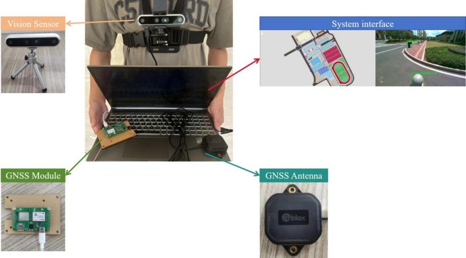 为检验研究所提出的盲人导航数据模型的有效性,研究团队以江西理工大学三江校区为研究区,并综合应用系列开源软件:GIS客户端软件OpenLayers、GIS服务器软件GeoServer、PostgreSQL数据库,以及相关硬件:realsenseD455视觉传感器、ublox ZED-F9P GNSS定位模块和深度学习模型Yolov8开发了一个盲人导航原型系统。从预期实验效果来看,该项研究成果具有重要的推广价值,并将产生重要的社会影响力。