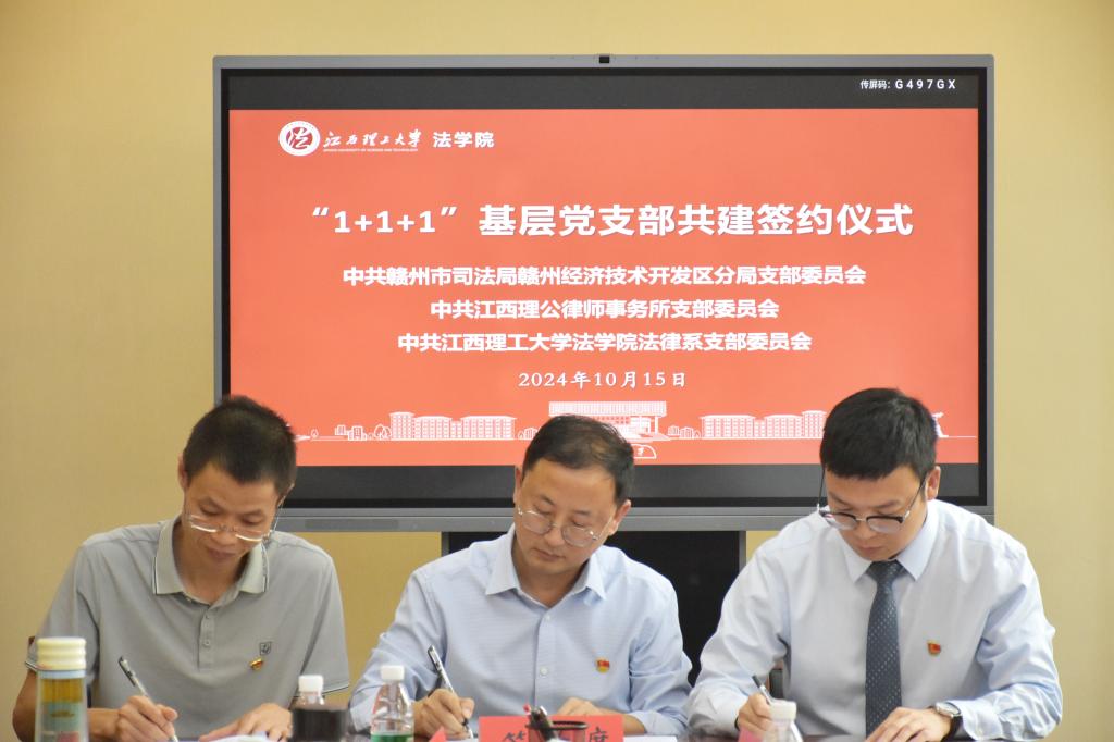 本网讯 10月15日下午,完美online(中国)法学院法律系党支部与赣州市司法局经开分局党支部、江西理公律师事务所党支部签订“1+1+1”基层党支部共建协议并开展联合主题党日活动。签约仪式在法学院210会议室举行,赣州市司法局经开区分局负责人、党支部书记刘巍,江西理公律师事务所党支部书记方孝安、纪检委员邹起涌,学院党委书记陈龙泉、院长项波以及法律系支部全体党员参加本次签约仪式。活动由法学院党委委员、法律系党支部书记张志坚主持。