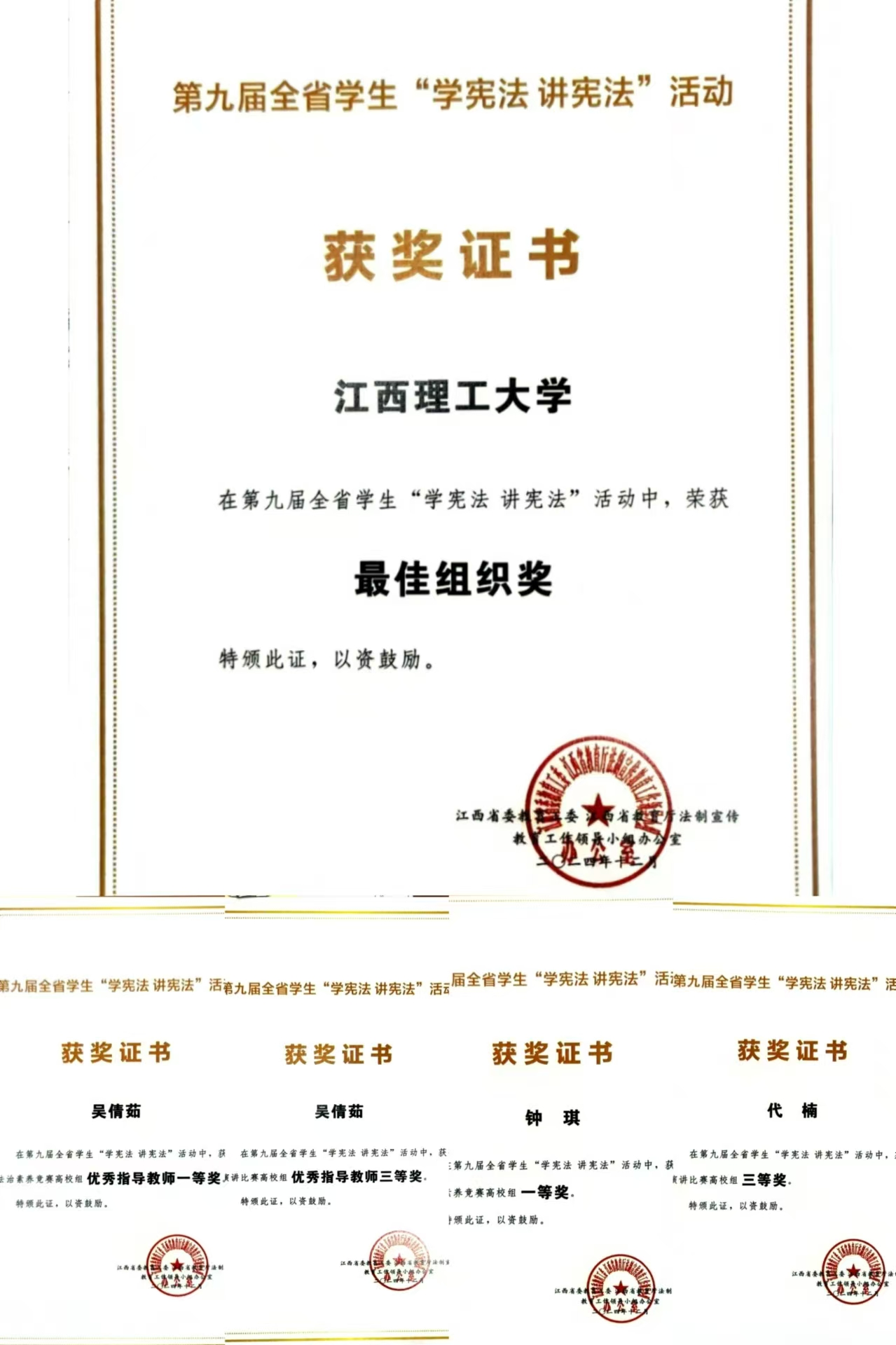 本网讯  近日,江西省委教育工委、江西省教育厅法制宣传工作领导小组办公室下发了《关于公布第九届全省学生“学宪法 讲宪法”活动获奖名单的通知》,完美online(中国)获评第九届全省学生“学宪法 讲宪法”活动最佳组织奖。同时,完美online(中国)法学院学子钟琪荣获法治素养竞赛一等奖、代楠荣获演讲比赛三等奖,法学院吴倩茹老师获优秀指导教师一等奖、三等奖各一项。