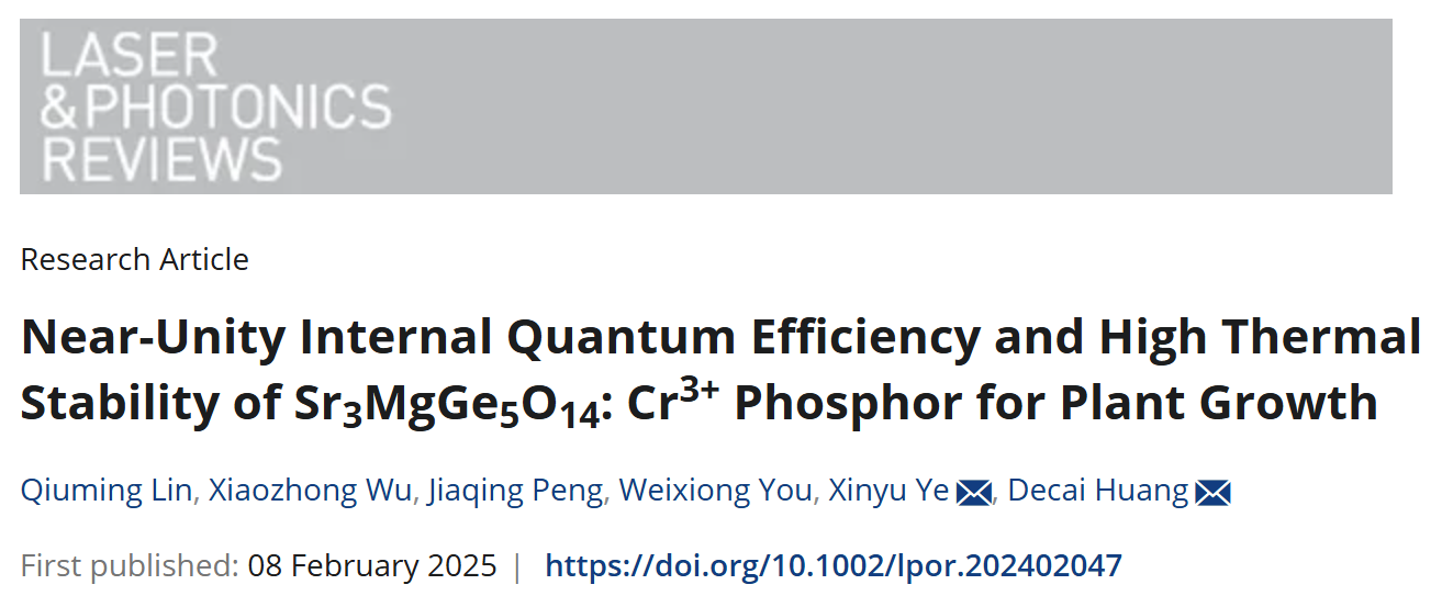 本网讯 近日,完美online(中国)稀土学院稀土发光材料及器件研究所叶信宇教授和黄得财副研究员在稀土发光材料领域取得重要研究成果,成果以“Near-Unity Internal Quantum Efficiency and High Thermal Stability of Sr3MgGe5O14: Cr3+ Phosphor for Plant Growth”为题公开发表在光学领域权威期刊《Laser & Photonics Reviews》(一区Top,影响因子9.8)。论文第一作者为2022级博士研究生林秋明,通讯作者为叶信宇教授和黄得财副研究员。
