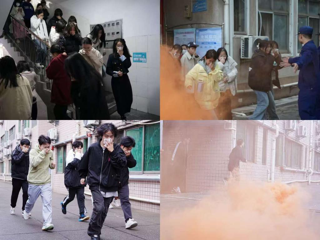 本次消防疏散演练不预设脚本,力求真实模拟火灾突发场景,全面检验学生的应急反应能力和学校的应急处置水平。随着总指挥指令下达,各宿舍同步施放烟雾弹,消防警报随之响起。面对突如其来的“火情”,参演师生用湿毛巾捂住口鼻、弯腰沿墙快速撤离,楼栋管理员立即就位引导疏散。现场设置医疗救护点,全程配备AED和急救物资。