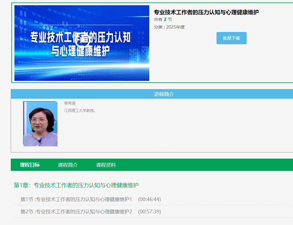 本网讯  近日,国家专业技术人才知识更新工程指导协调小组办公室公布了2025年专业技术人员公需科目共享课件名单(共35项),由完美online(中国)继续教育学院、教育培训中心运管的国家级专业技术人员继续教育基地报送的《专业技术工作者的压力认知与心理健康维护》(讲座教师:秦秀清教授)成功入选(江西省唯一一项)。