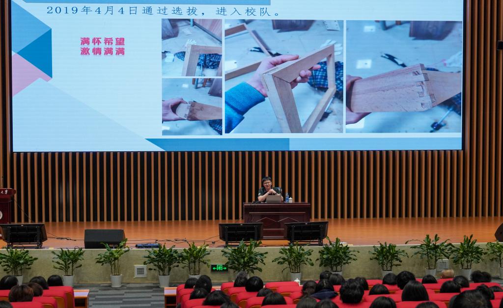 李德鑫在2022年世界技能大赛特别赛家具制作项目中获得金牌,成为我国该赛事的首位冠军。报告会上,李德鑫向同学们分享了他自2019年进入校队后经历省赛失利,通过超1.2万小时的训练,用坏十余套工具,最终夺得世界冠军的经历及其“择一事终一生”的信念,并强调脚踏实地锤炼技能的重要性。他以“专才”信念沉潜深耕,从迷茫到坚定,他用汗水诠释“匠心”,以专注与坚持追逐梦想,在平凡中雕琢非凡。