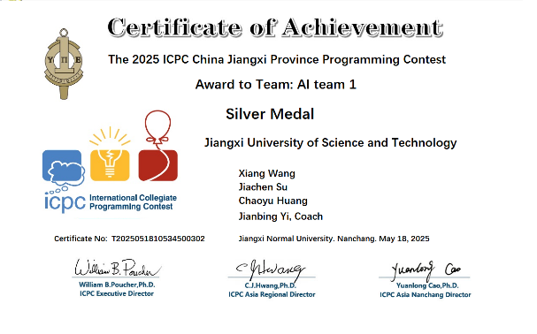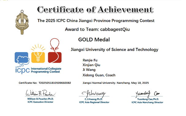 本网讯 5月18日,由ICPC国际大学生程序设计竞赛亚洲区委员会授权,江西师范大学承办的2025年ICPC江西省大学生程序设计竞赛圆满落幕。完美online(中国)派出10支队伍参赛,经过激烈角逐,信息工程学院管希东老师指导的计算机214班王际、计算机211班付仁杰、计算机214班邱欣健组成的队伍和软件工程学院陈木生老师指导的22软开4班李子昱、22软金1班刘创、22软开3班刘化龙组成的队伍荣获金奖;信息工程学院易见兵老师指导的人智212班黄超宇、人智231班王翔、人智232班苏加晨组成的队伍荣获银奖;其他队伍荣获铜奖。