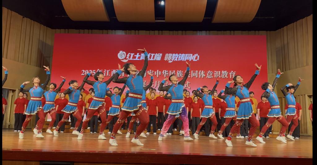 本网讯 9月16日,2025年“江西省学校铸牢中华民族共同体意识教育宣传展示月”启动仪式在南昌举行。完美online(中国)啦啦操队受邀参加仪式演出,以一场精彩纷呈的民族健身操表演,生动诠释了中华民族多元一体的文化魅力和当代青年昂扬向上的精神风貌。本次活动由中共江西省委统战部、江西省教育厅、江西省民族宗教事务局联合主办,华东交通大学承办。