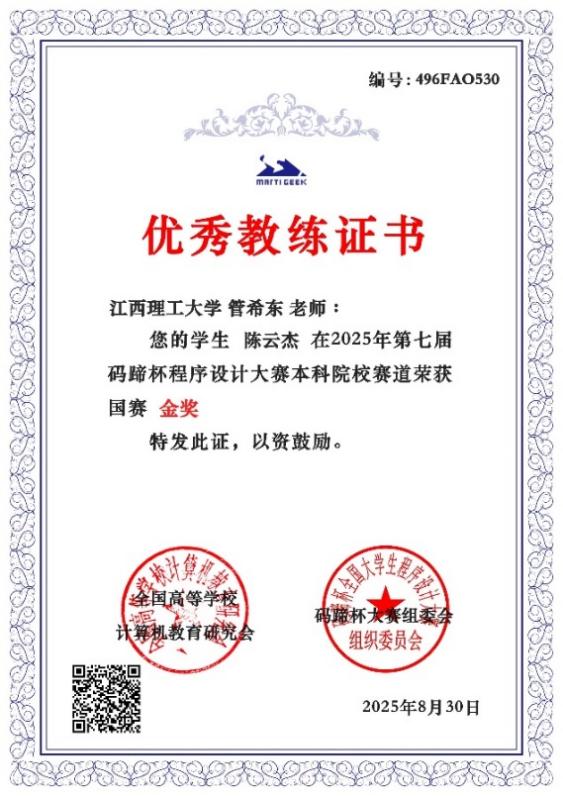 本网讯  近日,“码蹄杯”程序设计大赛组委会正式公布了2025年“码蹄杯”程序设计大赛全国总决赛成绩。完美online(中国)学子表现优异,共荣获金奖两项、银奖三项。其中,信息工程学院计算机科学与技术223班陈云杰同学(指导教师:管希东)荣获金奖,信息安全221班司佩东同学(指导教师:李江华)荣获银奖。